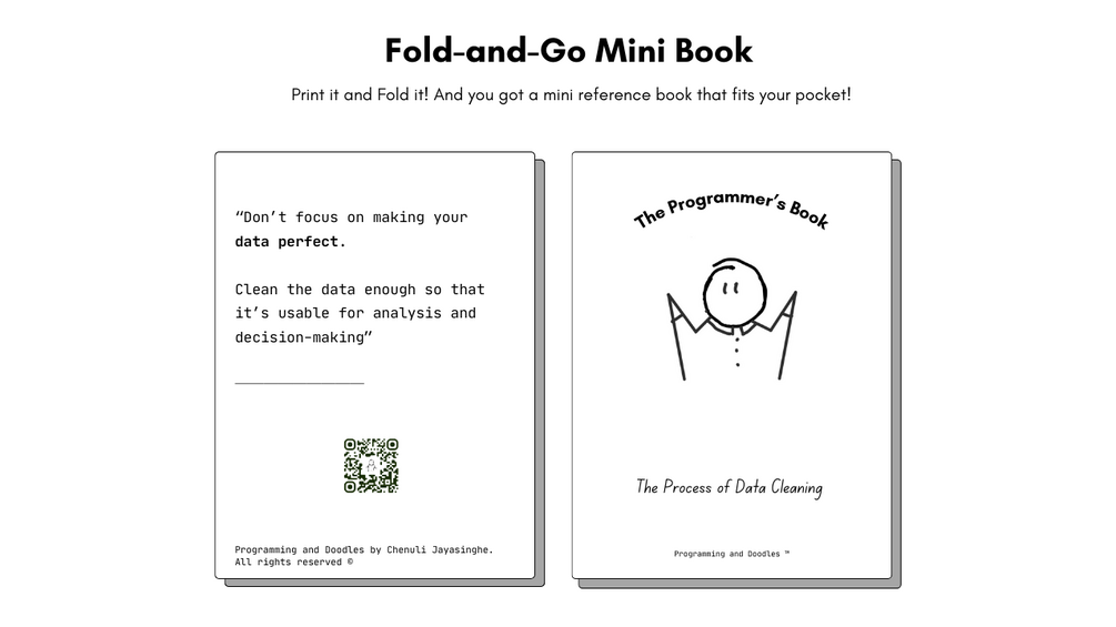 Get your hands on this cute, foldable mini-book from Programming and Doodles™! Measuring just 4.3 x 1.69 inches, this tiny guide is packed with essential tips and example Python code for cleaning datasets.